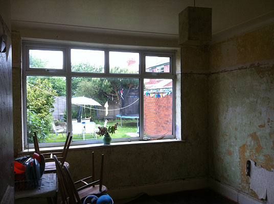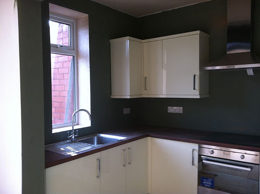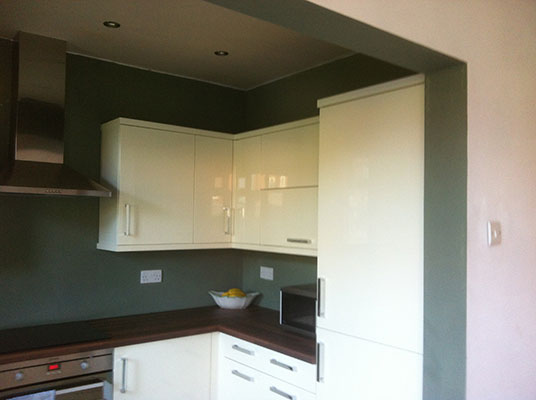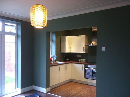 A recently completed kitchen renovations where we removed existing kitchen. We also removed the partion wall and added a steel beam we also bricked up the rear door and window. Removed the lounge window and fitted a large set of French door’s